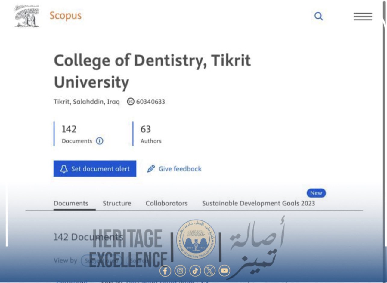 في إطار سعيها لتعزيز حضورها العلمي والبحثي على المستويين الإقليمي والدولي، حققت كلية طب الأسنان – جامعة تكريت إنجازًا أكاديميًا متميزًا من خلال إنشاء صفحتها الخاصة ضمن قاعدة سكوبس العالمية، التي تُعد من أهم قواعد البيانات المعتمدة للأبحاث العلمية.