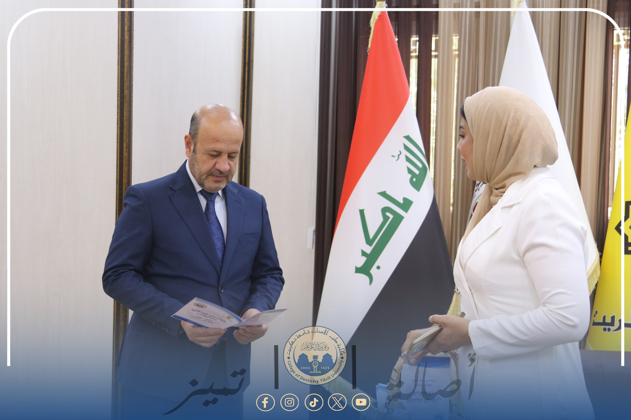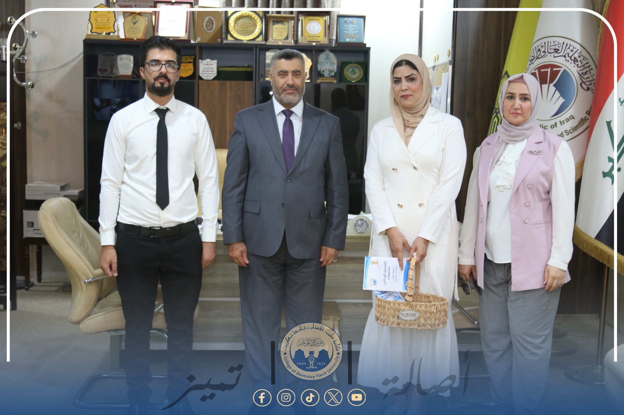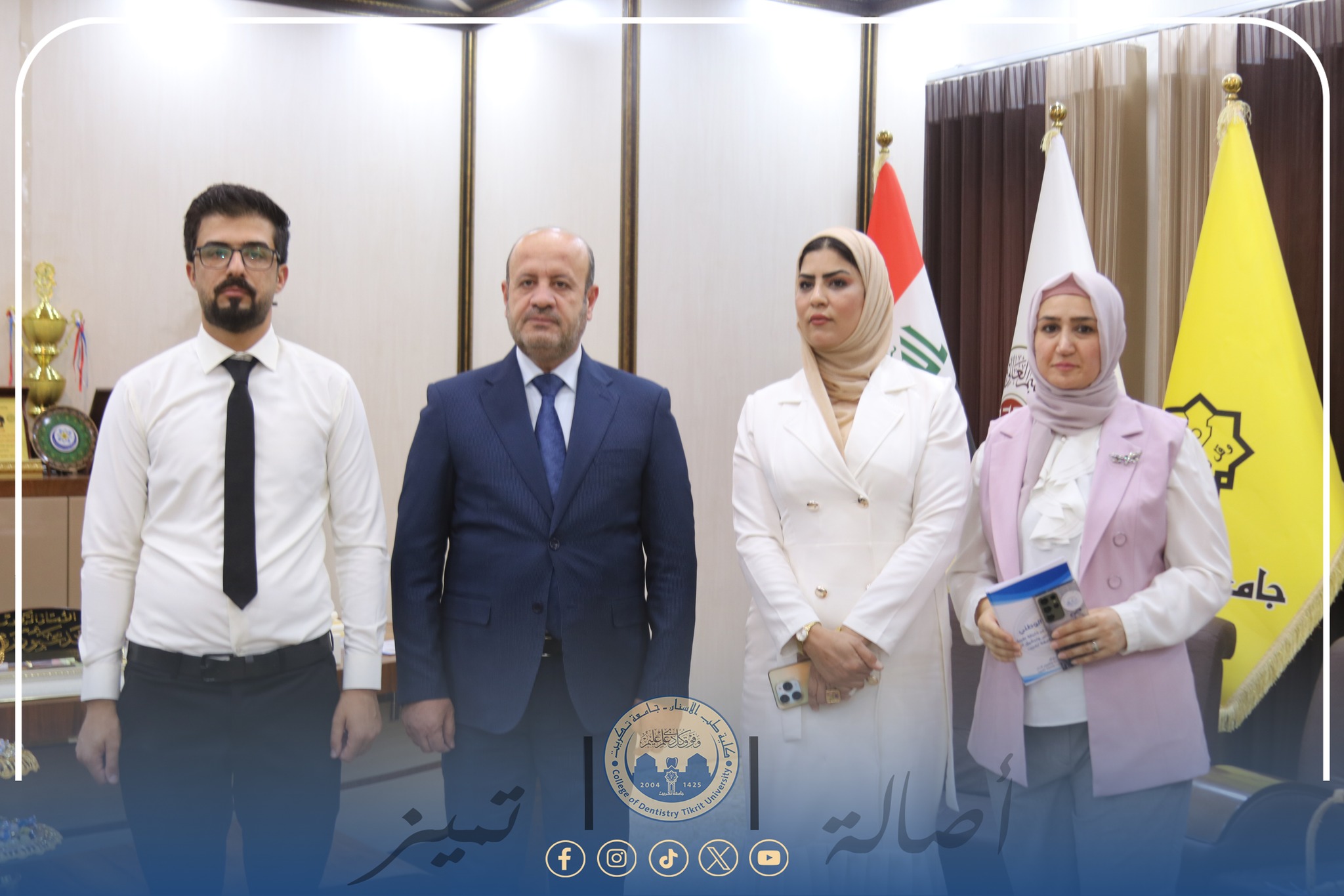 استقبل رئيس جامعة تكريت الأستاذ الدكتور وعد محمود رؤوف في مكتبه فريق حملة التوعية بالتصنيف الوطني للجامعات، والتي نظّمتها شُعب ضمان الجودة والأداء الجامعي في كلية طب الأسنان، وذلك ضمن إطار الجهود الهادفة إلى نشر ثقافة التقييم الأكاديمي وتعزيز الوعي بأهميته بين منتسبي الجامعة.
