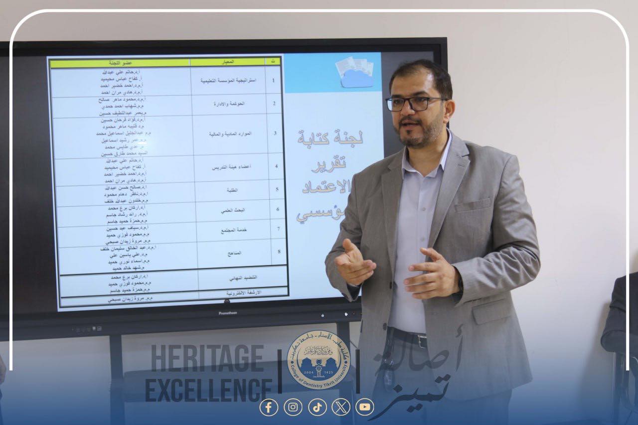 استضافت كلية طب الأسنان بجامعة تكريت اليوم ورشة عمل علمية ناقشت أهمية الاعتماد المؤسسي وتوجيه الأقسام العلمية في الجامعة نحو استكمال المتطلبات الخاصة به، وذلك ضمن إطار سعي الجامعة لتعزيز الجودة والارتقاء بالمستوى الأكاديمي والإداري.