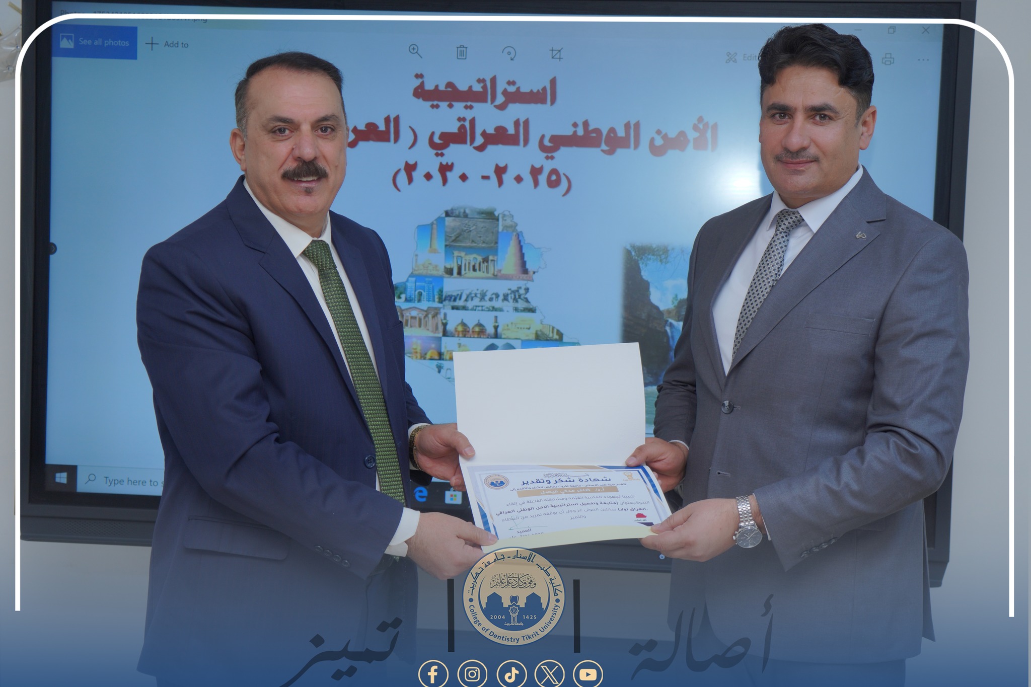 برعاية رئيس جامعة تكريت الأستاذ الدكتور وعد محمود رؤوف، وبإشراف عميد كلية طب الأسنان الأستاذ المساعد الدكتور محمد رحيل علي، أقامت كلية طب الأسنان بالتعاون مع كلية الطب البيطري، اليوم، ندوة علمية بعنوان: "متابعة وتفعيل إستراتيجية الأمن الوطني العراقي".