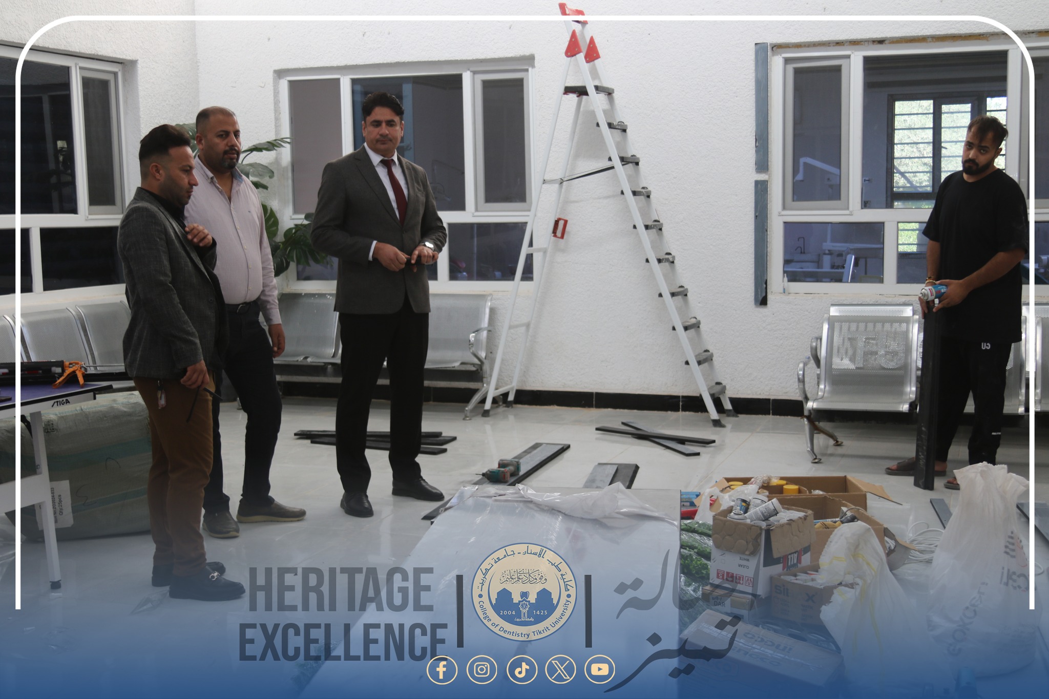 في إطار الجهود المستمرة لتطوير البيئة الجامعية وتحسين الخدمات داخل كلية طب الأسنان بجامعة تكريت، أجرى السيد عميد الكلية الأستاذ المساعد الدكتور محمد رحيل علي جولةً تفقدية للاطلاع على سير حملة إعادة تأهيل أروقة الكلية والحدائق الأمامية وعدد من المرافق داخل الأبنية.