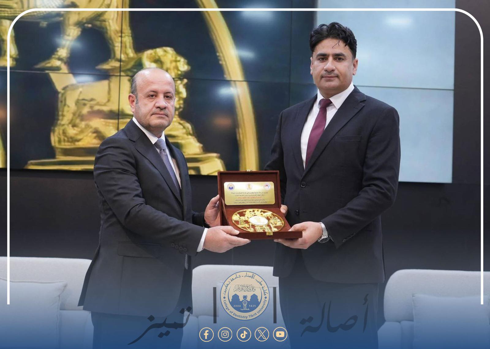 على هامش حفل تخرج طلبة كلية طب الأسنان في جامعة تكريت، كرّمت الكلية السيد رئيس الجامعة وفاءً وعرفانًا بدوره الكبير ودعمه المتواصل للمسيرة العلمية ورعايته الدائمة للطلبة والكليات.